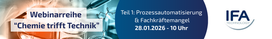 Im Auftakt der Webinarreihe „Chemie trifft Technik“ (Deurotech Group) zeigt IFA Technology praxisnah, wie intelligente Automatisierungslösungen helfen, Personalengpässe abzufedern, Produktionsprozesse zu stabilisieren und Investitionen nachhaltig zu sichern. Anhand konkreter Projektbeispiele erfahren Sie, wie Automatisierung gezielt entlastet, Transparenz schafft und Risiken im Betrieb reduziert.